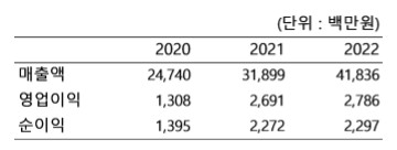 최근 3년간 경영실적은 모두 우상향의 증가세를 보이고 있다. 2022년 매출은 군용전시기 및 무기탑재용 컴퓨터장치 등 방산 부문 호조로 전년대비 31% 증가했다. 영업이익도 3.5% 상승했다.