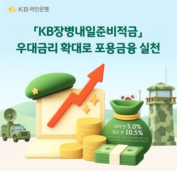 KB국민은행은 ‘KB장병내일준비적금’의 주요 우대금리 항목 금리를 상향 조정하고 최고 우대금리 한도를 확대하는 등 금리 혜택을 강화했다고 19일 밝혔다.