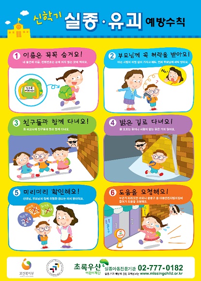 초록우산 어린이재단 보건복지부위탁 실종아동전문기관(소장 강병권, 이하 초록우산 실종아동전문기관)에서는 새학기를 맞아 교육과학기술부와 함께 3월 6일부터 178개 전국지역교육청 및 5,895개 초등학교에 <신학기 실종.유괴 예방수칙> 포스터를 제작하여 배포한다고 밝혔다.