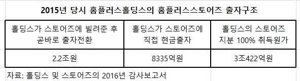 홀딩스는 초기에 투자받은 돈 중 2.2조원을 스토어즈에 빌려주었다가 바로 출자전환해 스토어즈의 자본금(주식발행초과금 등)으로 만들어 주었다. 나머지 8335억원은 스토어즈에 직접 현금출자했다.