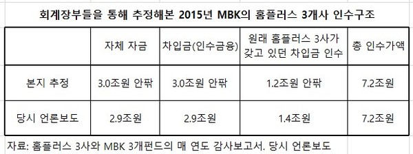 아무튼 MBK 3개 펀드와 홈플러스 집단의 장부만으로 볼 때 초기 인수가격 7.2조원 중 자체 투입자금이 3조원 안팎이거나 그 이하인 것은 분명하다. 이 때문에 당시에도 MBK는 ‘자기 돈 크게 안들이고 국내 2위 대형 마트를 거저 주웠다’는 비아냥이나 비판을 들었다.