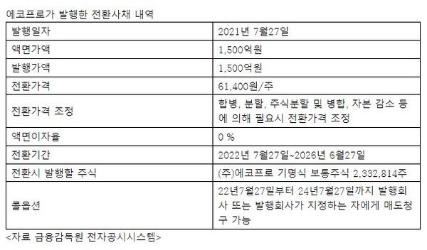 에코프로는 2021년 7월 1500억원의 CB를 발행하면서 40%(600억원)에 대한 콜옵션 권리를 갖기로 투자자들과 합의했다. 이 CB를 주식으로 전환할 수 있는 행사가격은 주당 6만1400원으로 정했다.