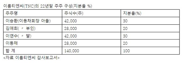 이 전환사채와 관련이 있어 보이는 에코프로 계열사가 또 하나 있다. 이룸티엔씨(이하 TNC)란 기업이다. 2022년말 기준 이 회사 주주 구성을 보면 이동채 회장과 부인인 김애희씨가 각각 20%씩, 아들과 딸인 이승환, 이연수씨가 각각 30%씩 갖고 있다. 이 회장 일가 가족기업이고, 아들과 딸 지분이 더 많아 사실상 자녀들 기업이라고 볼 수 있다. 잘 키우면 2세 승계에도 큰 역할을 할 회사다.