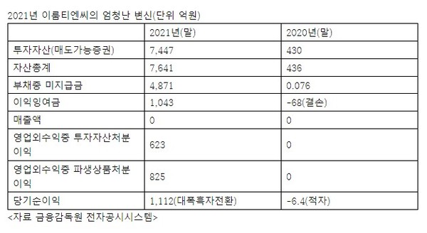 그러던 TNC가 2021년에 확 달라졌다. 매출은 여전히 제로(0)이고, 3.8억원의 영업손실도 냈지만 당기순이익은 무려 1112억원을 기록했다. 2020년 당기순익은 6.4억원 적자였다. 첫 흑자전환치고는 엄청난 흑자전환이었다. 2020년 말 436억원이던 자산도 2021년 말에는 7641억원으로 무려 17.5배나 늘어났다.