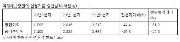 업계 1위 미래에셋증권은 연결기준 2분기 영업이익이 1565억원으로, 1분기 2816억원 대비 44.4%, 전년동기의 3212억원 대비로는 무려 51.2%나 각각 줄었다고 밝히고 있다.